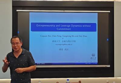 邹镇涛老师带来了主题为“Belief Dispersion in the Market for Event Risk”的报告。在邹老师提出的信念分散模型中,个体间对罕见事件发生概率的信念不一致,并且构成了一个连续的分布。尽管跳跃的真实概率保持不变,但是由于其不可观测,从而个体间信念的不一致会放大股票价格的跳跃幅度,并且股票期权的自激励跳跃风险会被定价。跳跃风险溢价显示逆周期变化。此外模型结果还指出信念离散度与罕见事件风险保险市场规模之间存在倒U形关系,即在个体间信念差异足够大时,过高风险溢价会降低个体参与保险市场交易的动机。