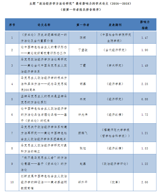 据悉,《中国政治经济学学术影响力评价报告·2019》遴选了23个研究主题的最有影响力学术论文。报告以中国知网(CNKI)下属的中国期刊全文数据库(CJFD)2016年1月1日至2018年12月31日的一千四百余篇政治经济学期刊文献为统计样本,根据论文的影响因子、被引用次数和被下载次数作为评价指标,科学计算得出每篇论文的影响力指数。