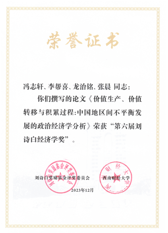 经济学系冯志轩教授与合作者所著论文《价值生产、价值转移与积累过程:中国地区间不平衡发展的政治经济学分析》(《经济研究》2020年第10期)获奖。