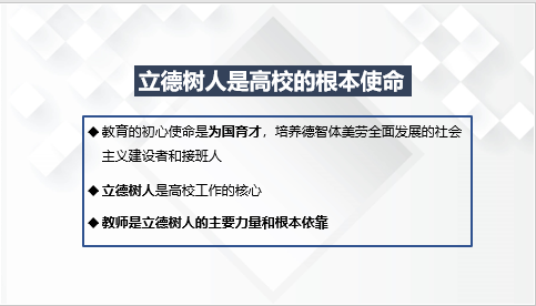 立德树人是高校的根本使命。党课的第一部分,大家一起重温了习近平总书记在全国思想政治工作会议上的讲话、在北京大学师生座谈会上的讲话等重要讲话精神,再一次重申了立德树人是高校的立身之本,教师是立德树人的主要力量和根本依靠。