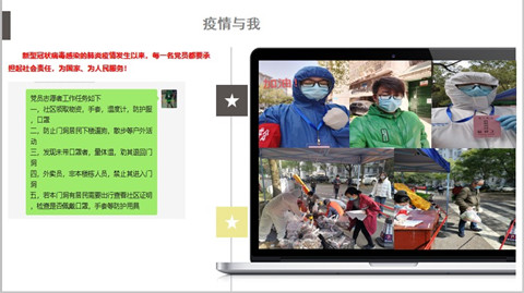 党员马尚作题为“疫情与工作”的分享汇报。他分别从疫情与我、疫情之思、疫情与工作三个方面进行分享。作为学院党员突击队第一批报名的成员,马尚一直坚持值守楼栋,在社区帮助人们领取物资、手套、温度计、防护服、口罩;阻止人们下楼遛狗、散步等外出活动;检查居民的口罩,防护服穿戴情况等工作,在一线承担起了为国家、为人民服务的社会责任。疫情对人们的认知带来了深层次的影响,而对工作开展的影响中,马尚认为,疫情带给我们信息化、网络化、数字化、多样化等变化。