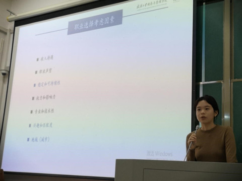 第一位分享嘉宾是夏阳同学,即将就职于中建三局城市投资运营发展有限公司,从事商业运营工作。夏阳同学分享了就业选择要考虑的因素,包括城市、职业性质,建议大家根据生活习惯和未来发展规划选择就业城市和职业。