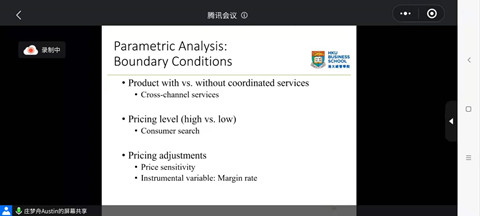 师生带来了“The Effects of Switching from Channel-Specific Pricing to Uniform Pricing in Omnichannel Retail: Evidence from a Quasi-Experiment”为主题的讲座。本次讲座由学院市场营销与旅游管理系寿志钢教授主持,黄敏学教授、崔楠教授、徐岚教授、曾伏娥教授、朱华伟副教授、柯丹副教授等40余名师生以及校友参加了本次讲座。