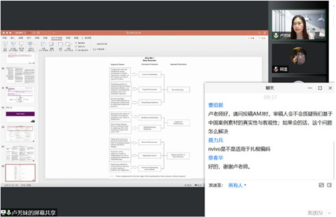 2021年10月29日上午,由学院工商管理系承办的“柯力工商管理学术沙龙”举行。本次论坛因疫情原因,由线下转为线上。南京大学管理学院博士研究生卢芳妹为师生们带来了“在管理学顶尖期刊发表中国企业案例研究:以一篇AMJ论文为例“的主题报告。卢芳妹从本篇顶尖案例研究作者的角度,重点介绍了案例研究类论文的研究思路以及与世界顶级管理期刊审稿人交流的心得。本次讲座由工商管理系主任刘林青老师主持,工商管理系江诗松老师以及清华大学、中国人民大学、AV淘宝