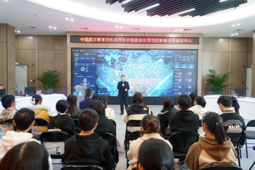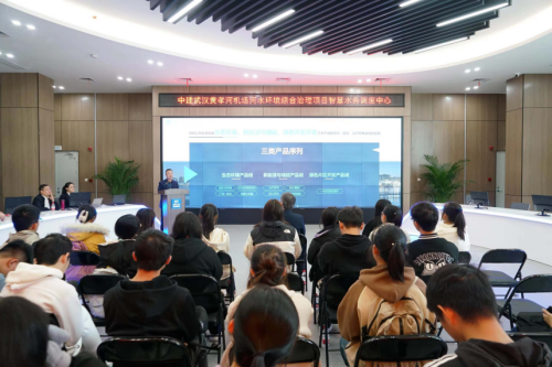 随后全体师生到黄孝河机场河水环境综合治理二期项目参观。绿投公司的有关负责人分别就黄孝河机场河的治理情况、公司科研成果、“绿色管家”项目管理系统以及绿色能源领域投资进行了详细介绍。针对绿投公司发展情况,董事长王涛表示秉持着“争先、争优、争光、创业、创新、创享”的指导思想,绿投公司形成了独具一格的“331业务”,即三项传统业务,三项战略新兴业务,一项国际业务。其中三项战略新兴业务分别是水务环保、新能源与储能、绿色片区开发,这也响应了国家的高质量经济发展的号召。同时强调了绿投公司是一个年轻化、高人才化的科创型企业。让同学们更深刻了解到“绿色”和“创新”构成了绿投公司高质量发展的底色。