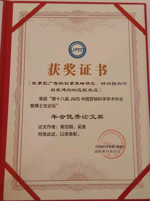 寿志钢教授和其指导的博士生吴美共同撰写的《故事型广告的叙事策略研究:时间指向与自我建构的匹配效应》被评为年会优秀论文。该论文提出,故事型广告的有效性取决于故事人物和故事时间等故事构成要素的选择与搭配。通过一项二手数据研究和两项实验研究,证明了指向未来的故事型广告搭配独立自我建构(相比于互依自我建构)的故事人物,广告的说服效果更好;而指向过去的故事型广告搭配互依自我建构(相比于独立自我建构)的故事人物,广告的说服效果更好。专家评委中欧国际商学院王雅瑾副教授和海南大学钟科副教授在点评里表示该选题十分有趣且非常重要,并针对性地给予了研究方法优化的专业建议。