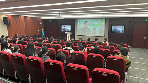 同学们在多功能厅认真观看联想武汉产业基地的介绍