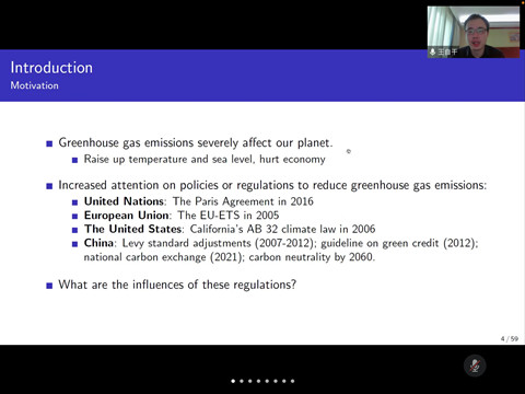 首先,王自干老师介绍了温室气体排放的重要性,欧盟、中国和日本等国家和地区由于地型因素对该议题十分关注,气候变化不仅会损害相关国家的生产率和GDP增长,而且也很可能改变全世界不同国家的比较优势。减碳政策对碳排放量有着重要的影响,最直接的影响是减少煤炭使用量,比如,法国煤炭使用量逐年下降,减碳政策实施至今,碳排放量已经下降了20%。此外,即使实施了相关减碳政策,由于已建好的厂房在短时间内拆除的成本较高,产能向清洁能源方面的过渡仍较为缓慢。