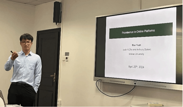 随后,袁茂老师就Prominence in Online Platforms(在线平台中的头部效应研究)进行了分享。袁老师应用均衡模型,从评估成本的角度出发,探讨了头部在线平台对商户利润的影响。基于该模型,袁老师提出了五项命题,并发现平台的头部效应对卖家竞争的增强或软化取决于评估成本,并且当评价成本较低时,平台可以增加消费者剩余。此外,袁老师还发现,平台的头部效应会给卖家带来三种结果:赢输、双赢、双输。分享结束后,老师们就平台的实际应用、命题检验方式等话题展开讨论。
