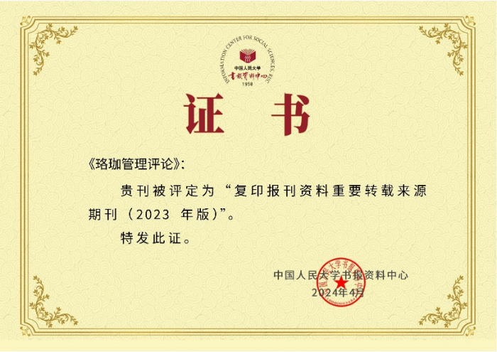 2024年4月25日,中国人民大学书报资料中心正式发布《复印报刊资料重要转载来源期刊(2023年版)》,《珞珈管理评论》持续入选“复印报刊资料重要转载来源期刊”。