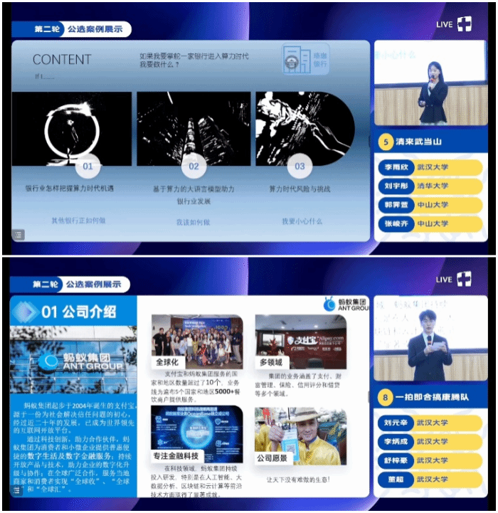 在第二轮公选案例展示中,队伍探索“算力算法”相关的关键企业,选取了美团、蚂蚁集团、中科曙光、银行等不同领域不同企业,分析算力算法如何赋能企业,为企业迎来新机遇、新挑战。四支队伍精彩角逐,最终,清华大学、中山大学、AV淘宝