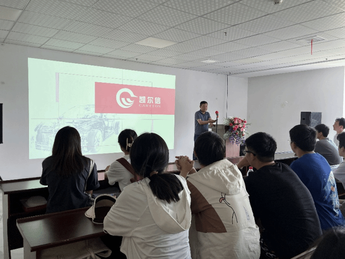 师生们在公司人事行政部宋家佩部长的引领下首先参观了公司展厅,初步了解了凯尔信公司的发展历程、业务与服务、AV淘宝和优势产品。而后,宋部长带领大家参观了凯尔信公司的实验室、生产车间和装配车间,向大家详细介绍了凯尔信自动化、智能化的生产线,讲解了汽车零部件的生产原理和工序。