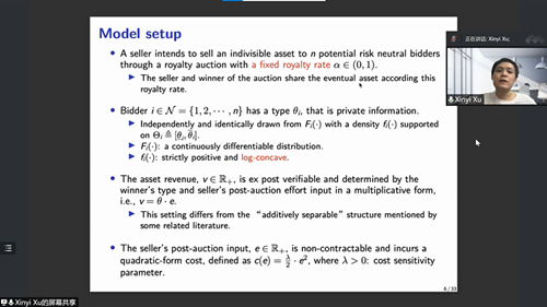 最后,徐欣毅老师从建立一个模型入手,强调了模型中竞标者的异质性和卖方潜在的道德风险,并且假定卖方期望回报最大化。在模型构建之后,徐老师具体说明了在royalty auction中,卖方承诺的三条原则:allocation rule, transfer rule和information disclosure rule。然后引入了trustworthy mediator并说明其作用。在模型分析中,聚焦于不失一般性的direct mechanism.经过详细的分析过程,最终得出了最优的royalty auction并得出了卖方回报的最大值。