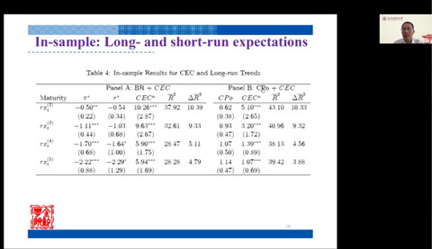 再次,朱小能教授分析了当前学者对债券价格反映信息的争议。因为宏观经济预期的复杂性,针对长期债券和短期债券的价格是否包含了有关通胀预期、工业产出值、GDP增长的信息,不同学者持有不同的看法。本次论坛分享的研究将长短期经济形势预期纳入债券价格的信息集。研究结果也表明,长期经济形势预期和短期经济形势预期都对债券价格有重要影响,并且二者呈现互补关系。