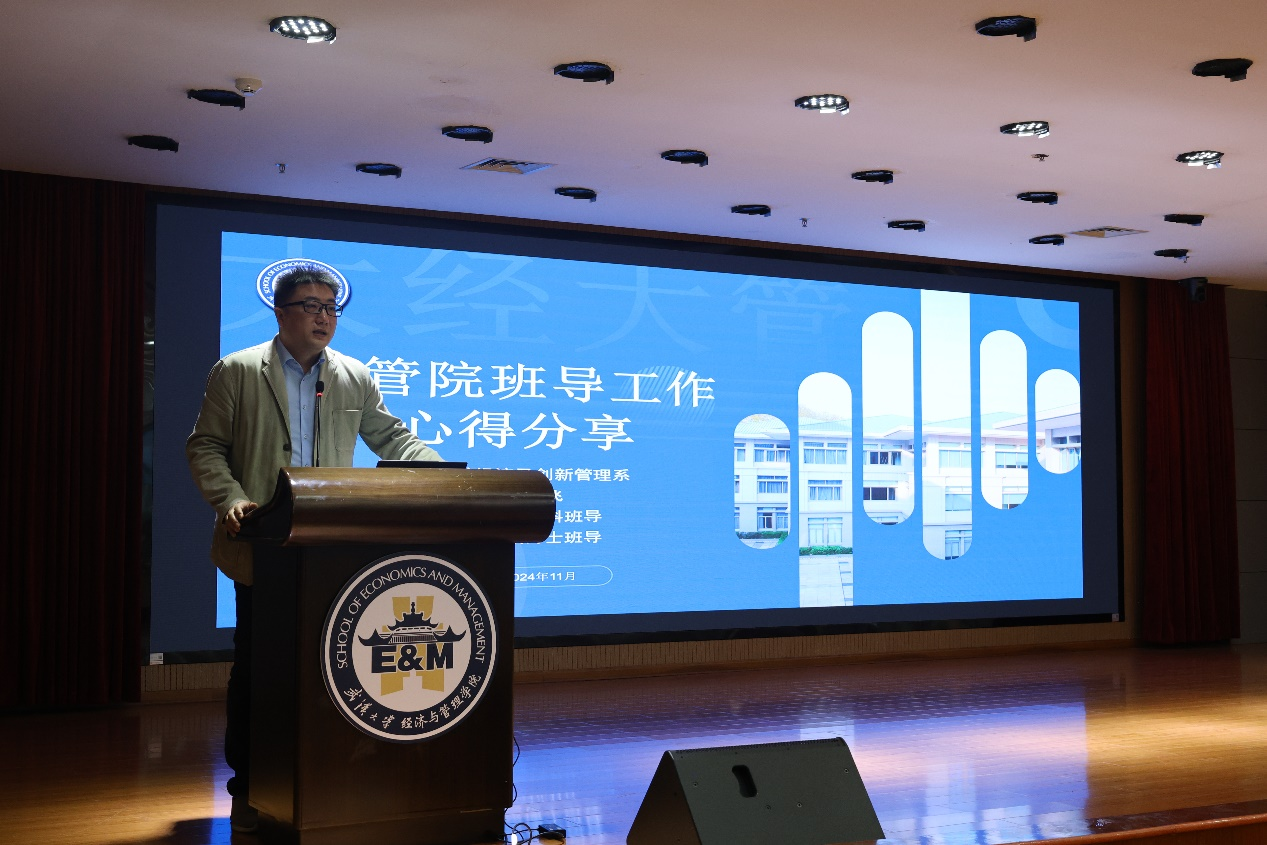 随后,本科2320班和2023级工商管理博士班班导师张司飞进行班导工作心得分享。张司飞表示,班导师应明确与班级学生的关系定位:作为老师,应传道授业,而非仅仅督导;作为学长,应倾力相助,而非心存私念;作为兄长,应无私奉献,不图回报。同时,他还特别指出,班导师应时刻关注学生的心理健康,通过正式与非正式相结合的方式,深入了解学生的内心世界,及时发现并解决学生的困惑与迷茫。