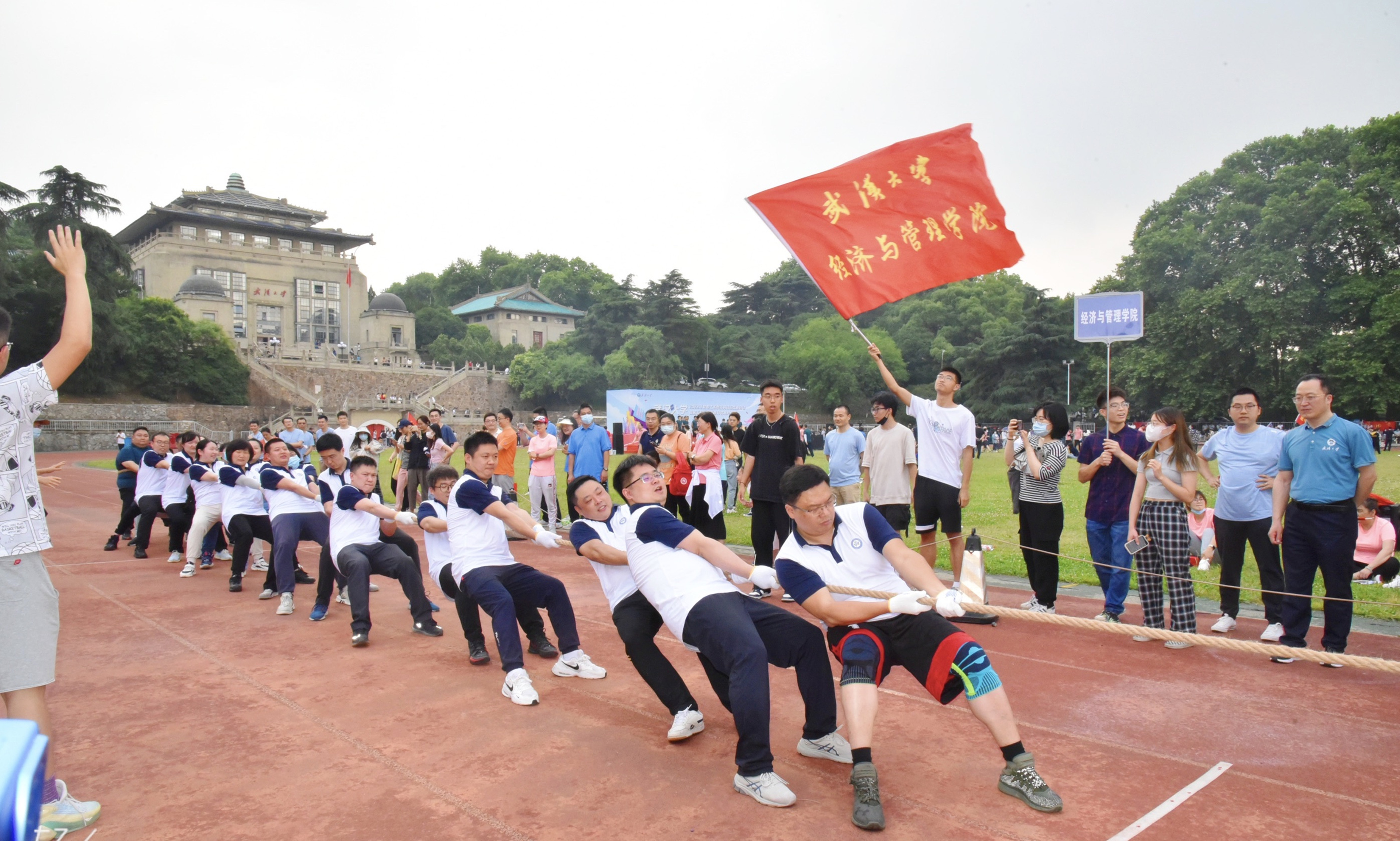 2022年5月,学校在9·12操场举行教职工拔河比赛。比赛即将开始,经管院健儿准备就绪、严阵以待。