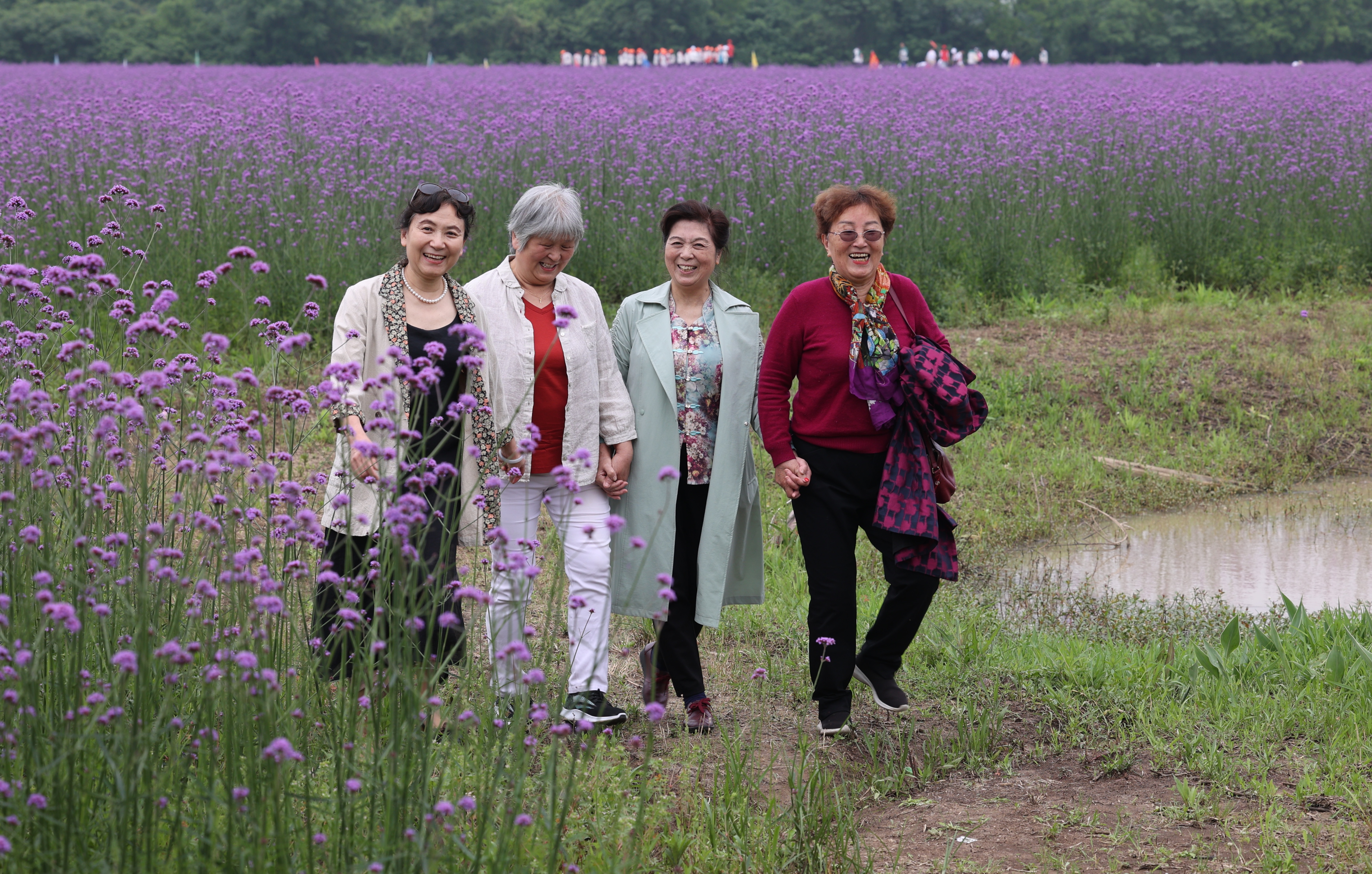 2021年5月18日,经管院组织50多位离退休教职工到武汉市东西湖区最美西湖赏花春游,开展簇拥鲜花庆党百岁主题活动。照片记录了几位退休女老师经历疫情之后,在似锦的繁花间徜徉,笑靥如花。