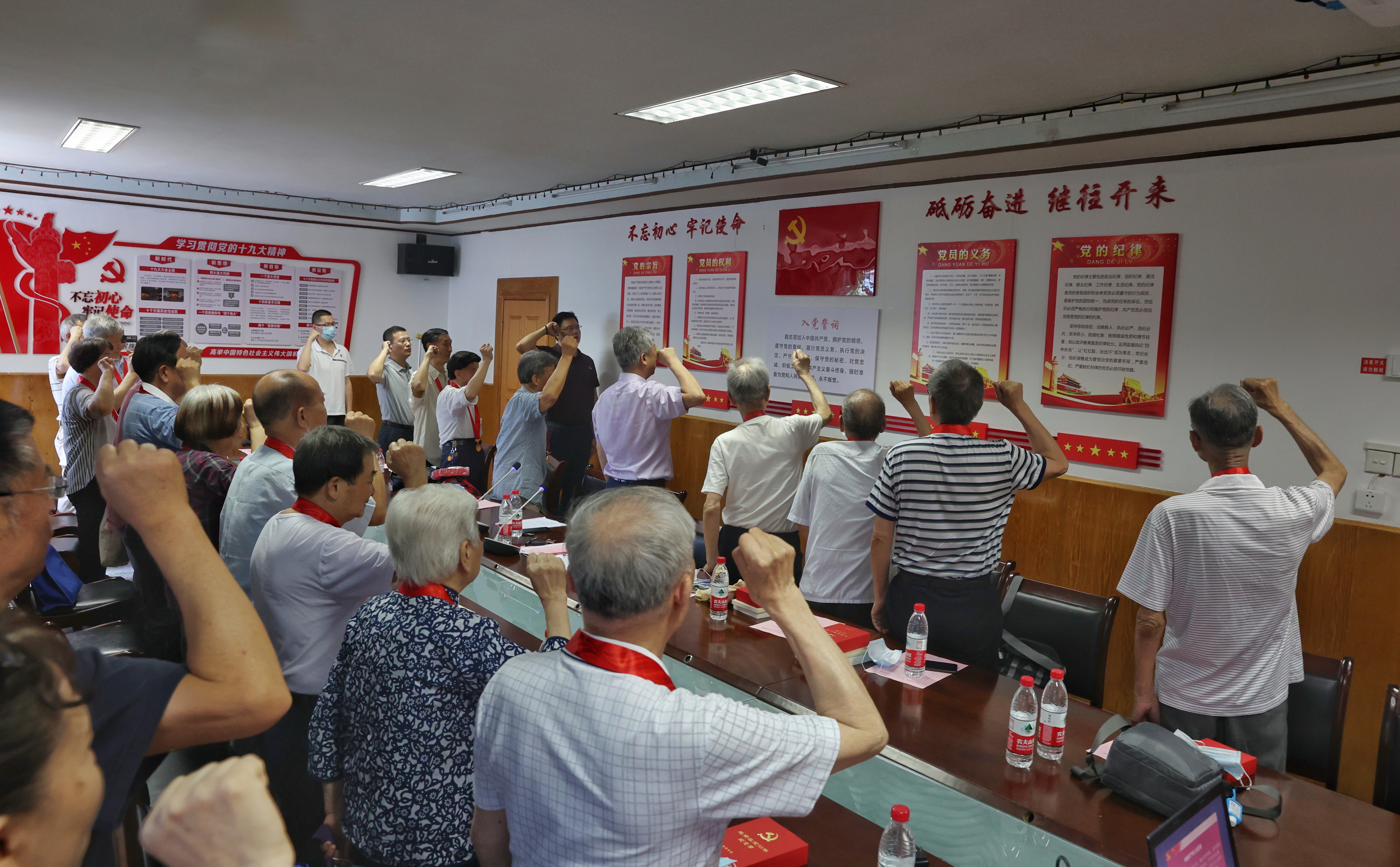 2021年6月25日上午,经管院党委在校离退休工作处一会议室举行了“光荣在党五十年”纪念章颁发仪式。学院党龄50年以上老党员心潮澎湃,纷纷回忆自己在党50余年为党的教育事业奋斗的心路和历程。照片为重温入党誓词环节,在场的同志们共同在鲜艳的党旗下郑重宣誓,进一步坚定理想信念,永葆党员本色。