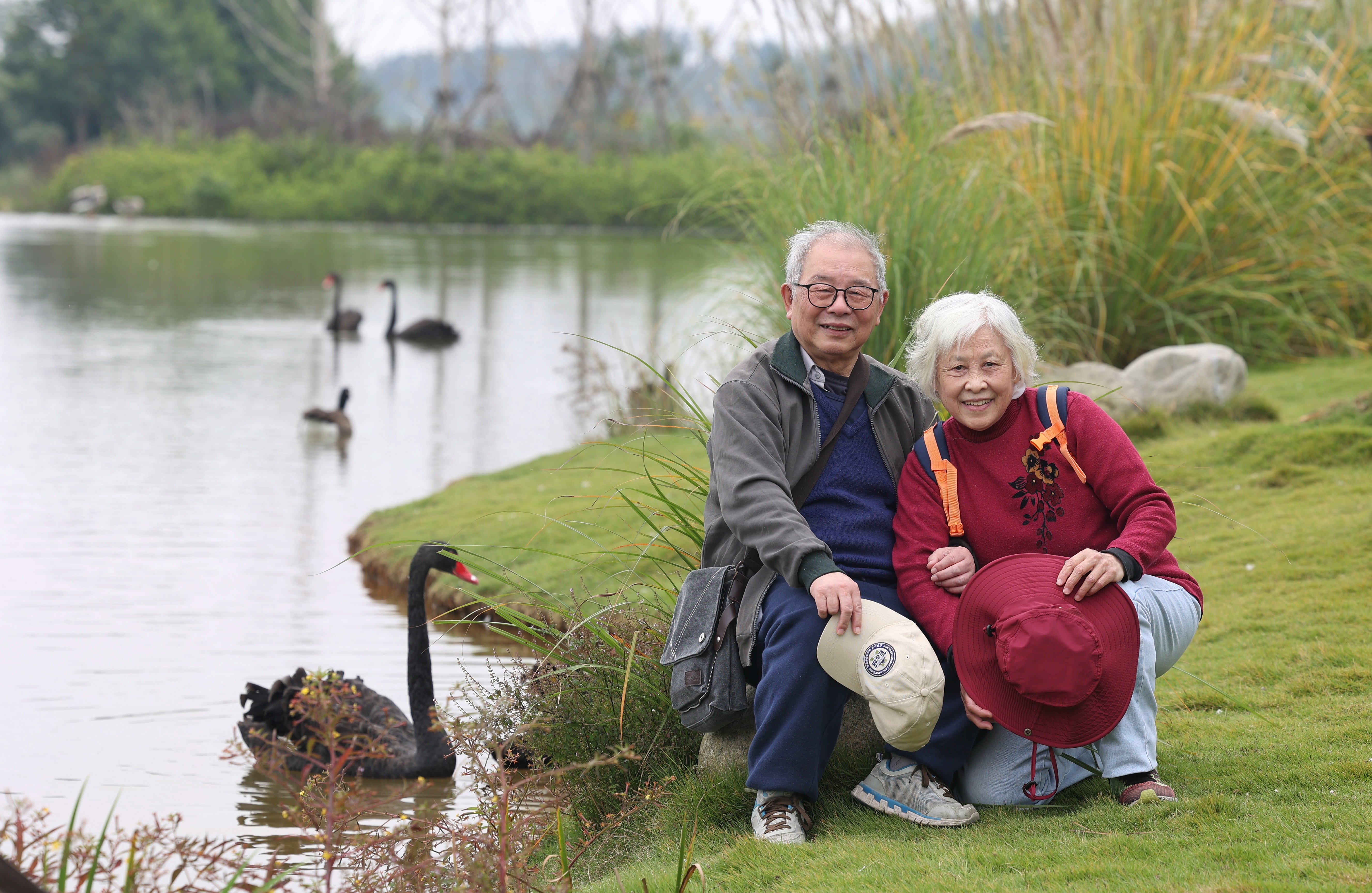 2021年10月29日深秋时节,离退休老师到咸宁仙鹤湖湿地公园秋游,参观贺胜桥战役纪念馆。高玉芳教授夫妇在湖边留影,美丽的黑天鹅也赶来送上深情的祝福。