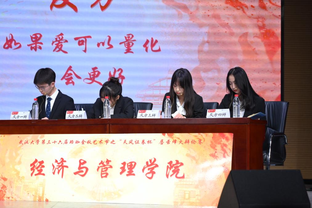 在金秋辩论赛全程,经管辩上场队员共有五位,分别是:李思菁、张昕、贾依扬、陈澈、申秉男;决赛上场队员及辩位为一辩张昕、二辩贾依扬、三辩陈澈、四辩申秉男。决赛辩题为:如果爱可以被量化,会不会更好。计算机学院持方为正方,即“如果爱可以被量化,会更好”;我方持方为反方,即“如果爱可以被量化,不会更好”。