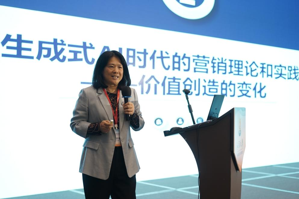 中国高等院校市场学研究会服务营销专委会授予曾伏娥 “专委会专家顾问”称号。曾伏娥在会议开幕式上作主题为“生成式人工智能时代的营销理论与实践”的报告,深入剖析了生成式人工智能技术的本质特征,并阐述其对营销领域的深远影响。曾伏娥指出,生成式AI的快速发展不仅推动价值创造的方式发生了显著变化,还带来价值传递模式的创新。她结合最新的研究成果与行业应用,探讨生成式AI如何赋能价值创造过程中的数据获取、创意提出和市场验证,以及生成式AI如何从“时”和“空”两方面改变价值传递模式。