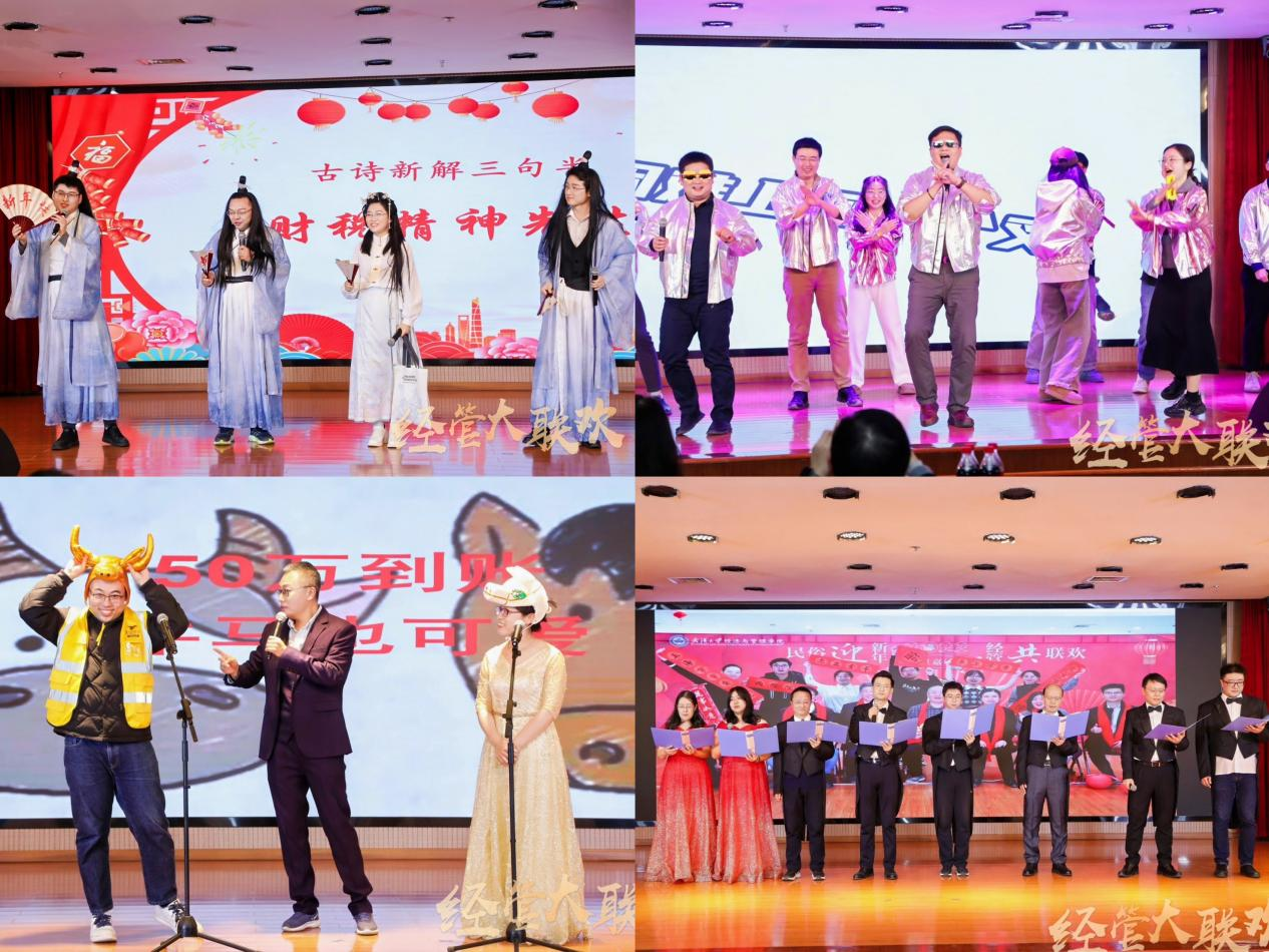 随后,一曲曲动人的旋律、一幕幕精彩的表演轮番上演。财政与税收系带来的曲艺三句半《财税精神颂》以诙谐幽默的方式展现了财税人的风采;本科生工作办公室和研究生工作办公室的唱跳节目《敬业阵线联盟》、经济学系的《欢乐中国南北热舞串烧》通过动感十足的舞蹈与歌声,彰显了教职工的活力与激情;技术经济与创新管理系的歌曲《让世界充满爱》更是唱出了温暖与希望。各系、各办公室的表演团队各展所长,以多样化的艺术形式,生动诠释了学院教职工积极向上、勇于创新、满怀信心、拥抱未来的精神面貌。