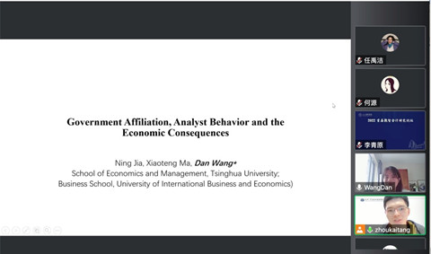 会计系承办的蓝月亮珞珈会计论坛第100期通过线上的方式举行。论坛邀请了对外经贸大学王丹老师做题为“Government Affiliation, Analyst Behavior and the Economic Consequences”的学术论文报告。论坛由会计系周楷唐老师主持,李青原、潘红波、林晚发等多位老师和学生参加了此次论坛。