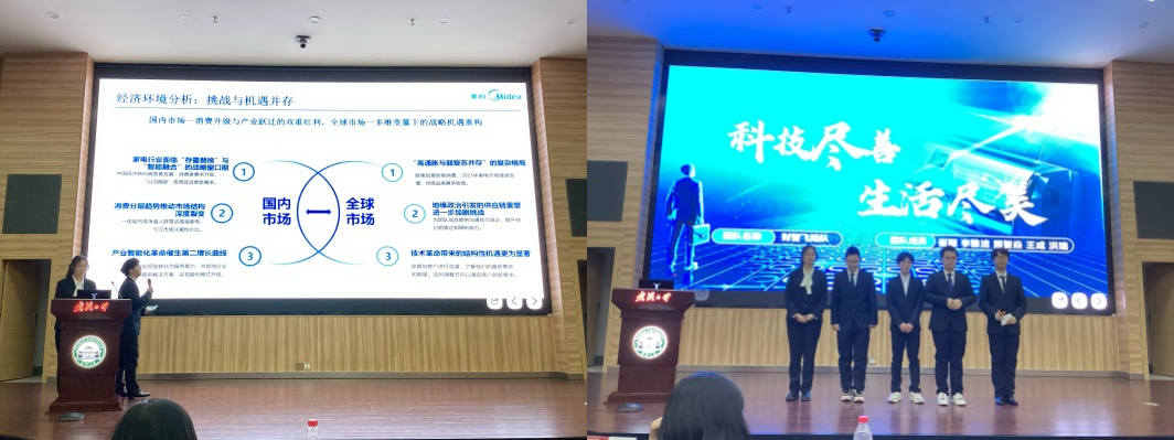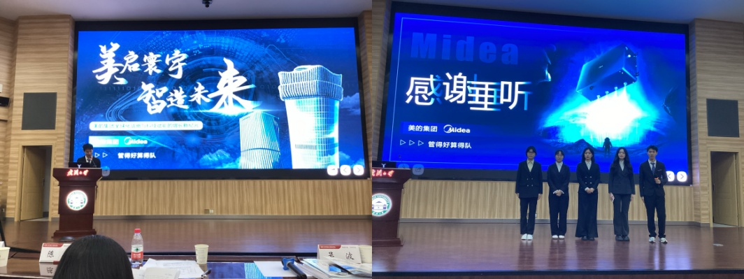 的韩佳轩担任队长,李奕慧、郑茜月、陈琪、苏雯铃为团队成员。团队带来题为“尽善科技,尽美生活”的美的集团商业策划书,基于过去三年业绩指标,为未来市场开拓提供方案。他们深入剖析美的经济现状、面临的市场环境和财务指标,指出公司竞争优势与现存不足,并针对问题提出发展策略,如打造AI赋能的用户交互技术、提高生产线的自动化、数智化、兼顾能源管理与环境管理、扩大海外产能。团队还提出积极扩展线上线下渠道,通过社媒营销、IP联名等,提高品牌知名度。最后,基于上述分析,他们进行了未来三年财务预测,包括总营收、毛利率和归母净利率并预测美的未来将以数智化、低碳化、全球化加速向智能家居、工业互联的科技集团跃迁。