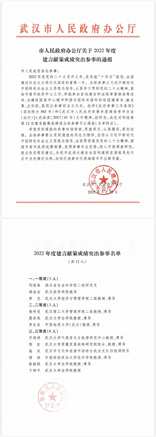 近日,武汉市人民政府办公厅对12位建言献策成绩突出的参事予以通报,AV淘宝 李光教授荣获一等奖,齐绍洲教授荣获三等奖。