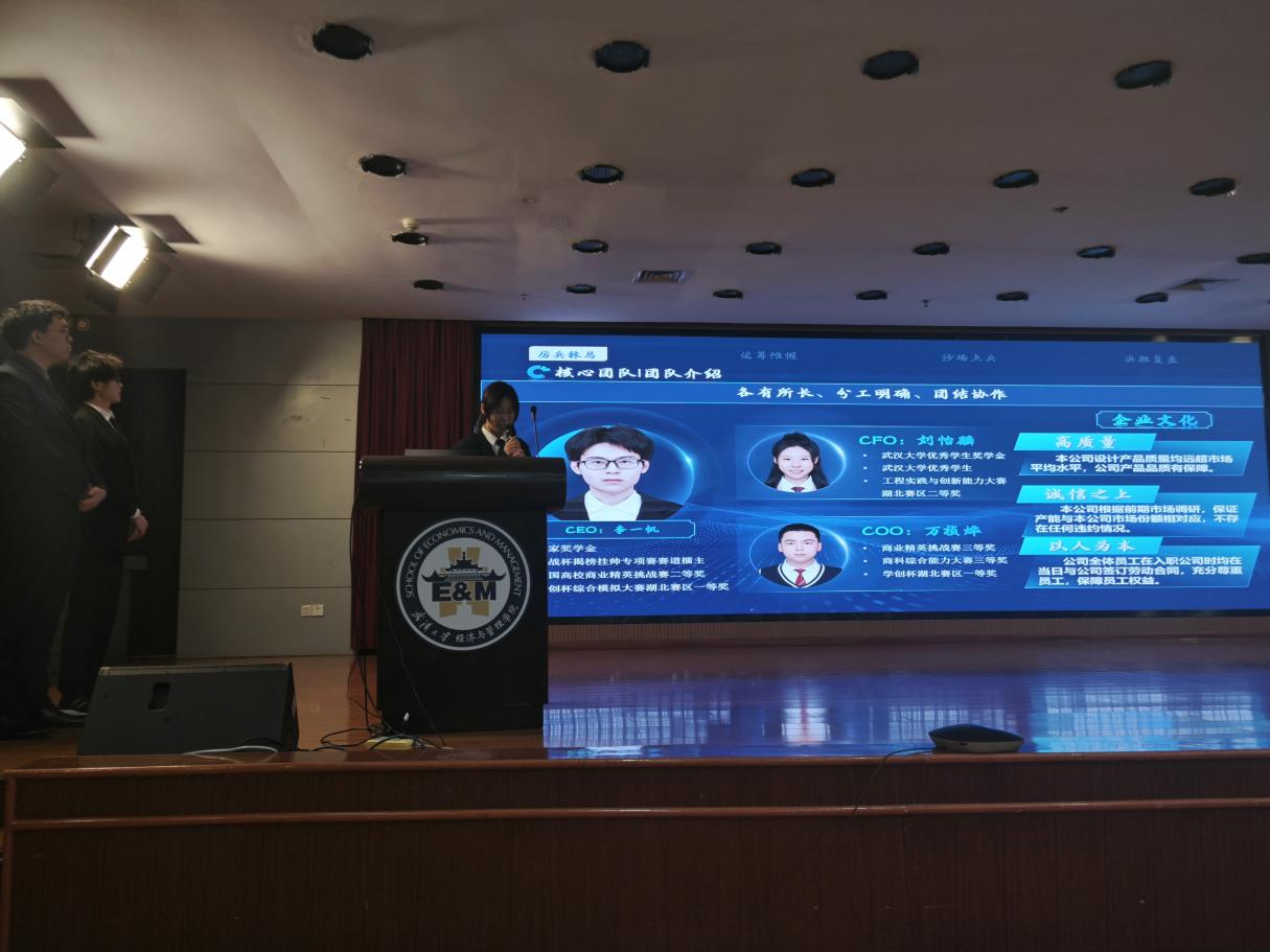 的张芷窈和来自电气学院的杨源朝。团队以全视角路演PPT深度解析初赛方案,从战略规划、经营详情、实战复盘、未来展望四大维度展开专业展示。战略层面,团队秉持“战略前置,厚积薄发”理念,构建覆盖多元场景的全场景空气净化解决方案,依托学科交叉优势实现专业分工协同。经营规划聚焦市场开发、产品矩阵、供应链优化及财务杠杆策略,通过对标行业标杆构建差异化竞争路径。实战复盘环节,团队详解四阶段经营策略,展现从首季垫底到最终登顶的逆袭路径。总结展望阶段,团队基于SWOT分析明确发展路径,提出运用STP理论细分市场、JIT模式优化产能,深度融入“创新驱动”思政理念,未来将持续完善战略布局。答辩环节中,团队成员针对评委提问逻辑清晰、专业精准作答,全面覆盖问题核心,以扎实的专业功底与对比赛的深度理解,彰显出色的临场应变能力与团队协作素养。