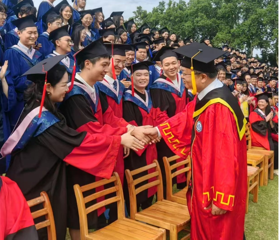 校长张平文院士步入现场时,人群中爆发出雷鸣般的掌声与欢呼。“明诚弘毅,经世济民!”嘹亮的学院口号响彻云霄,不少同学激动地挥舞着手中的学位帽。张校长微笑着向同学们挥手致意,并亲切地与前排的学生代表一一握手,关切地询问他们的毕业去向。这亲切的互动,瞬间点燃了全场的热情。