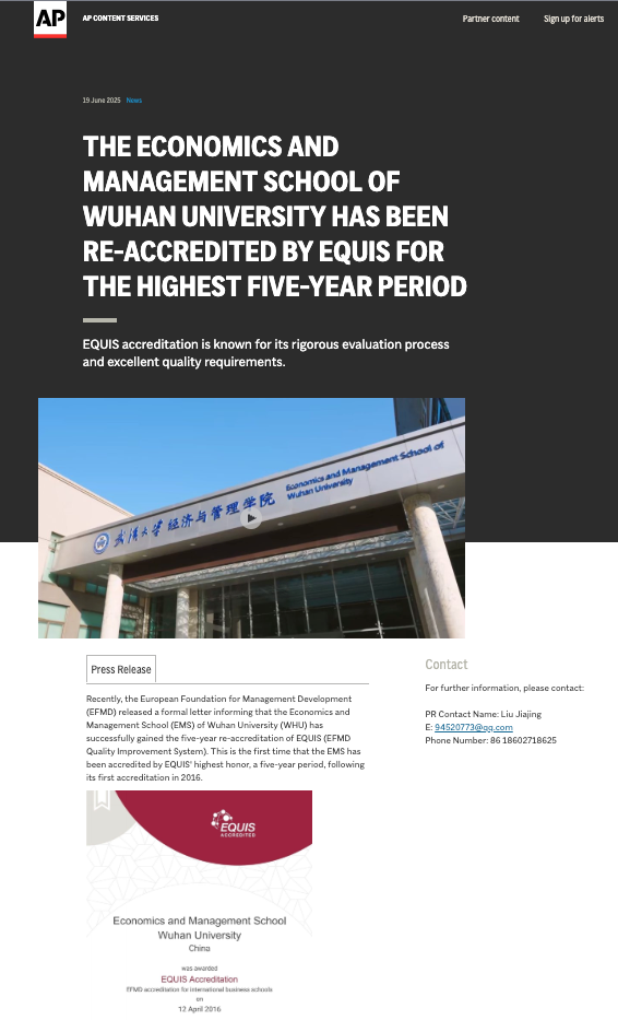 近期,学院成功通过了EQUIS五年期再认证。这一消息以新闻标题“The Economics and Management School of Wuhan University has been Re-accredited by EQUIS for the Highest Five-year Period”发布后,迅速被美联社等国际主流媒体广泛传播。随后,包括美国雅虎财经、加拿大环球邮报、英国金融时报、新浪香港在内的739家权威媒体也纷纷转载了这一新闻,引起了全球范围内的广泛关注。这一重要的里程碑不仅证明了学院在教学质量、科研创新以及国际化办学方面得到了国际权威机构的高度认可,而且也标志着学院已经成为全球管理教育领域的一个重要参与者。这一成就显著提升了中国高等教育在国际舞台上的影响力和话语权。