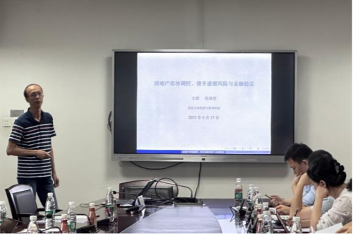 王胜老师带来了题为“房地产市场调控、债务通缩风险与金融稳定”的报告。基于包含异质性生产部门和金融机构的DSGE模型,王胜老师分析了房地产市场调控政策对经济波动的影响。对房地产市场供给与需求侧紧缩的调控均导致房地产企业去杠杆,抵押品价格下跌;市场流动性短缺使得生产部门投资和产出下降,引发债务通缩风险。