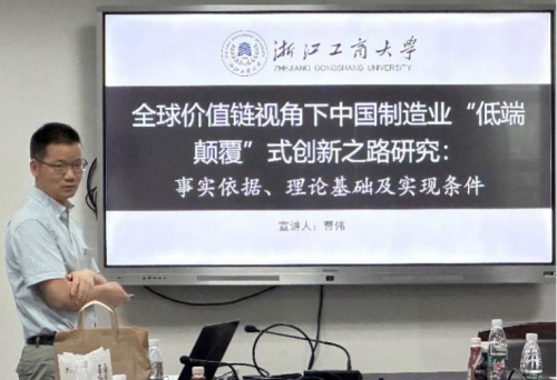 曹伟老师对其研究“全球价值链视角下中国制造业‘低端颠覆’式创新之路研究:事实依据、理论基础及实现条件”进行了展示。通过构建全球价值链的Stackelberg博弈分析框架并基于全球价值链的视角,曹伟老师点出,中国制造业部分企业通过参与全球价值链,实现了低端颠覆式创新。该研究对比降低成本式和提高质量式两种研发策略的优劣势,首次提出“先降低成本后提高质量”可能是中国制造业实现低端颠覆式创新的最优路径。