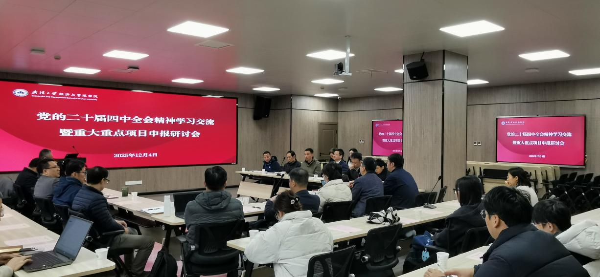 2025年12月4日,学院召开“党的二十届四中全会精神学习交流暨重大重点项目申报研讨会”。学院党委书记王丽萍出席会议,特邀叶初升教授、范斐教授作专题报告,来自各系所的三十余位教师齐聚一堂,共学全会精神、共商项目申报事宜。副院长黄敏学教授主持。