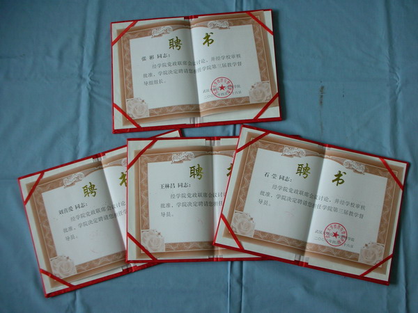 决定聘请张彬、王林昌、石莹、刘喜爱等同志担任学院第三届教学督导员。张彬任学院教学督导组组长,王林昌、石莹、刘喜爱为学院督导组成员,聘期两年(2006年4月至2008年3月)。