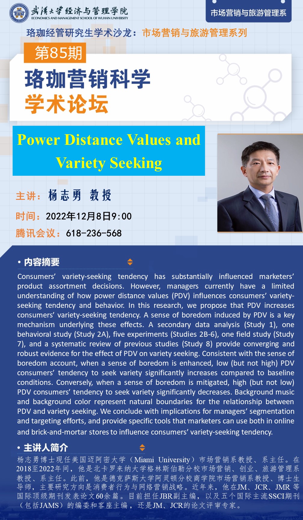讲座人简介:杨志勇博士现任美国迈阿密大学(Miami University)市场营销系教授、系主任,在2018至2022年间,他是北卡罗来纳大学格林斯伯勒分校市场营销、创业、旅游管理系教授、系主任。此前,他是德克萨斯大学阿灵顿分校商学院市场营销系教授、博士生导师,主要研究方向是消费者行为与网络营销战略。近年来,他在《Journal of Marketing》、《Journal of Consumer Research》、《Journal of Marketing Research》、《MIS Quarterly》、《Journal of Experimental Social Psychology》、《Journal of the Academy of Marketing Science》、《Journal of Retailing》、《Journal of Management Information System》等国际主流学术期刊上发表论文近60篇。并在国际学术会议上多次做主题演讲,发表70多篇会议论文。目前担任《Journal of Business Research》的副主编、及五个国际主流SSCI期刊(包括《Journal of the Academy of Marketing Science》)的编委和客座主编,还是《Journal of Marketing》、《Journal of Consumer Research》等十八种国际学术期刊的论文评审专家。自2010年以来担任加拿大社会科学与人文研究项目的特邀评审专家,自2016年以来成为香港香港研究资助局(Research Grants Council)特邀评审专家。