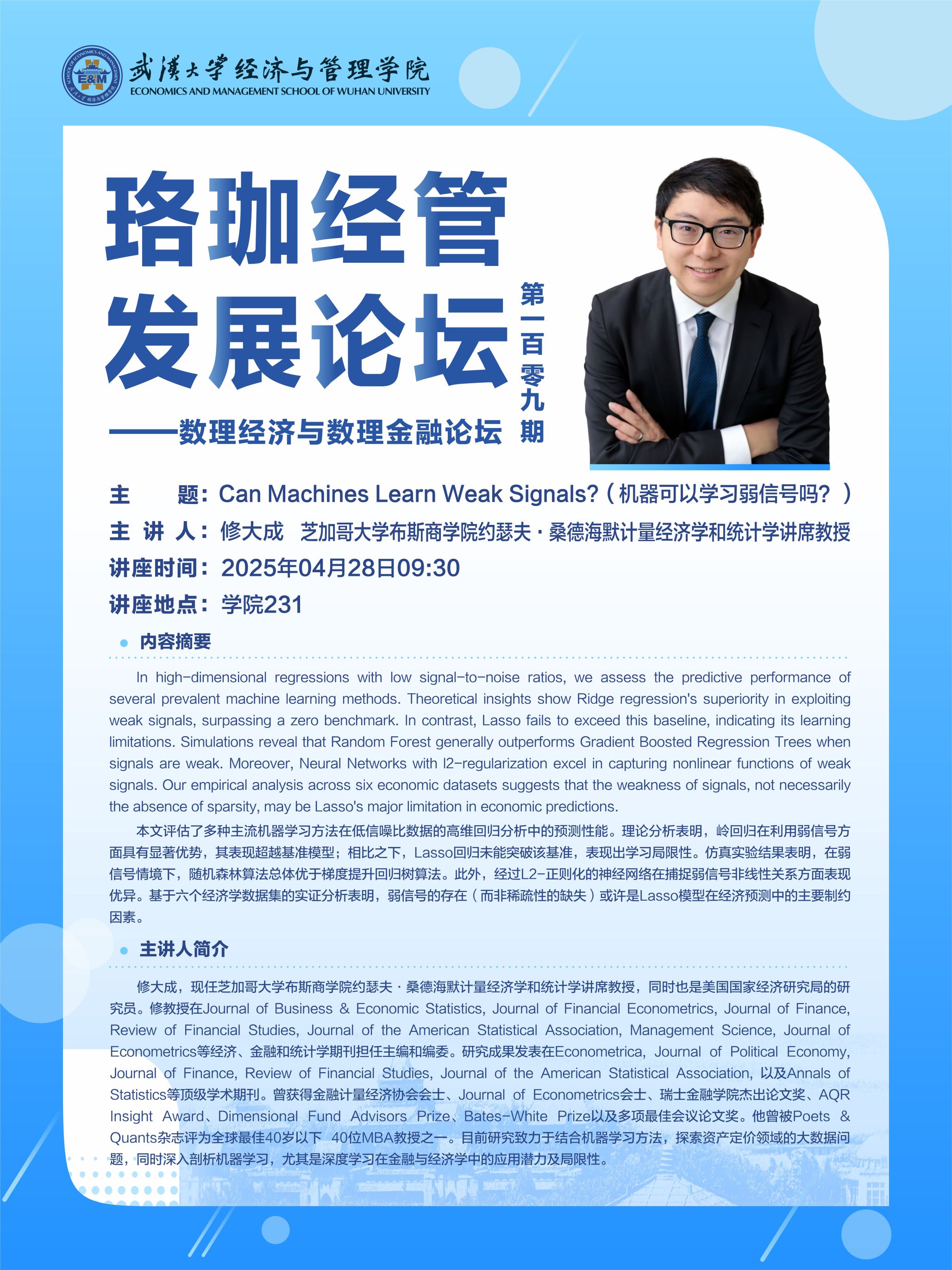 讲座预告|珞珈经管发展论坛第一百零九期——数理经济与数理金融论坛