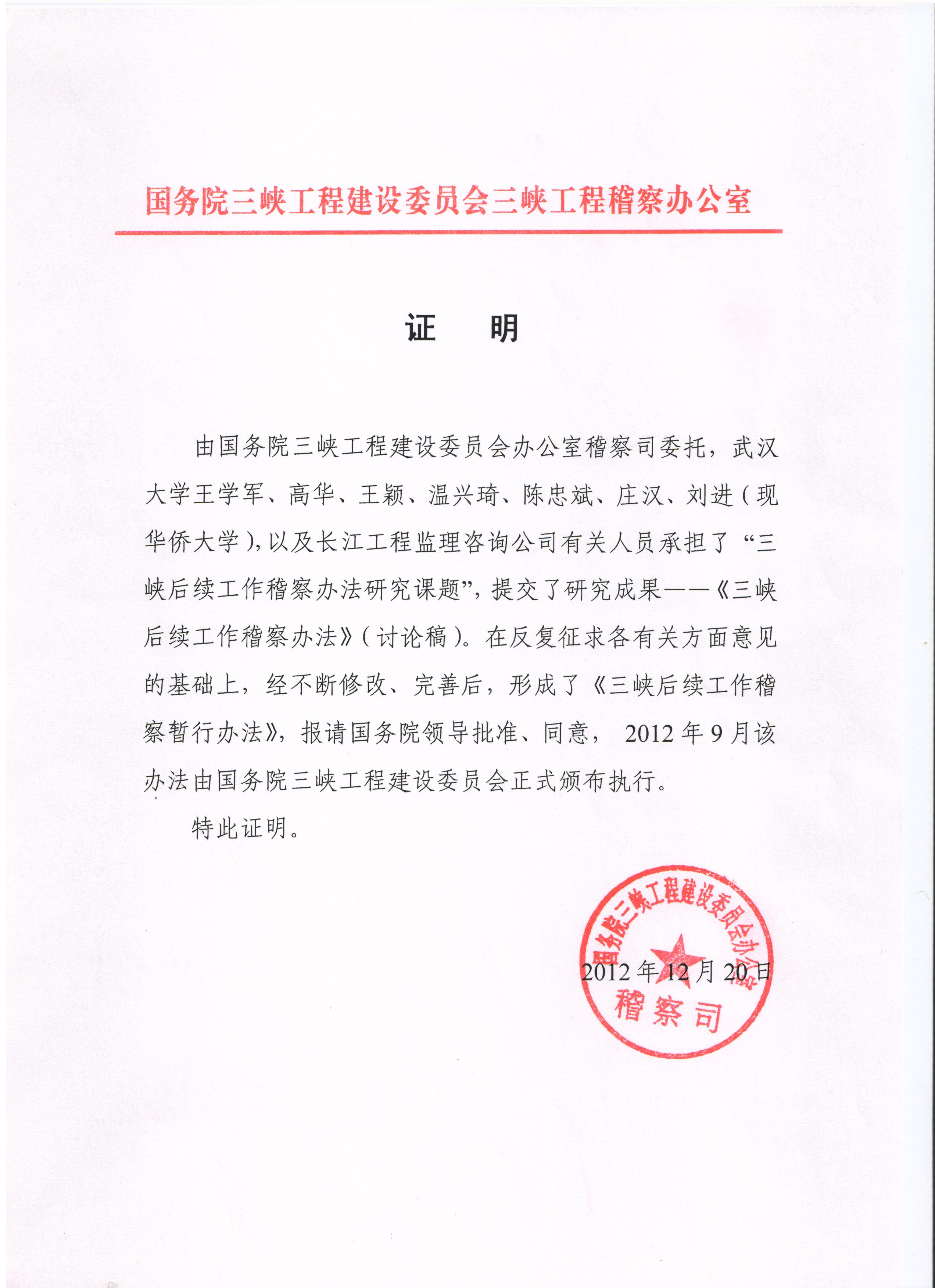 王学军教授主持的“三峡后续工作稽查办法研究课题”项目,圆满完成各项要求和任务,其研究成果《三峡后续工作稽察暂行办法》获国务院领导批准,于2012年9月由国务院三峡工程建设委员会正式颁布执行。
