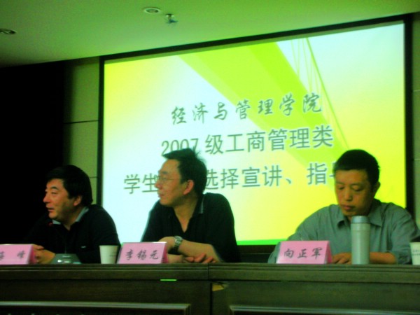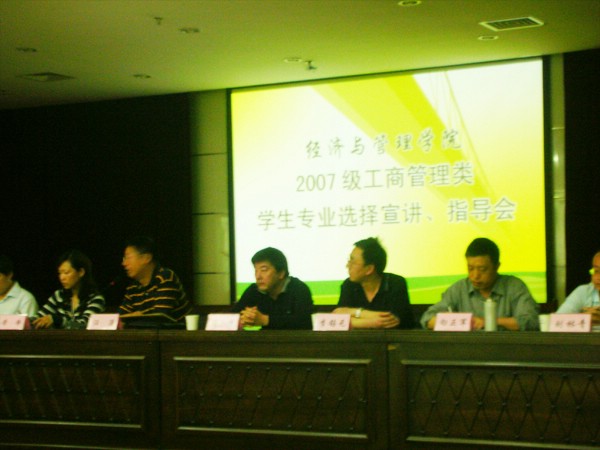 2007级经济类、工商管理类学生专业选择宣讲、指导会在学院报告厅和教工活动中心同时举行。