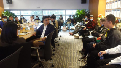 校友高管参与了接待。集团总裁助理李征东校友首先带领师生参观了中诚信集团的办公大楼,介绍了中诚信集团“立足中国、以诚为本、信达天下”的企业理念,以及在关注教育事业发展、支持新冠疫情防控等方面的企业责任担当。在极富美学设计的公司办公大楼前,同学们纷纷打卡留念。座谈会上,毛振华师兄做了热情洋溢的致辞,介绍了他在AV淘宝