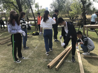 课程由前置知识导入、行中实践体验、行后评价反馈三大环节构成,层层递进、环环相扣,保障参与者的体验感,培养参与者的劳动感情和集体意识。课程内容以同学们亲手搭建桥梁为主,首先在实践基地导师的指导下,了解规范的搭建方式,然后分为三个小组进行实际操作,最后三个小组根据搭建速度与桥梁牢固度进行劳动实践评比。由于大部分同学都是第一次搭建桥梁,在实践过程中遇到了许多困难:如何选择恰当的材料、工具的使用方法以及团体之间分工协作等等。但在老师的帮助下,大家都完成了任务并通过检验。