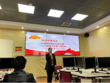 为了深入学习贯彻落实习近平新时代中国特色社会主义思想,将高校立德树人的根本任务以春风化雨、润物无声的方式落地落实落细,建立多层次多渠道的交流平台,加强师生间的沟通联系,2020年10月27日下午,实验与信息中心党支部与2020级博士第1党支部在中心422实验室联合开展了“情系学生 • 服务育人”支部结对共建党日活动。活动由实验与信息中心党支部书记任竹芸老师主持,2020级博士生第1党支部书记刘燚爽同学协助。实验与信息中心党支部7名教职工党员和2020级博士第1党支部19名党员、预备党员及入党积极分子参加了本次活动。