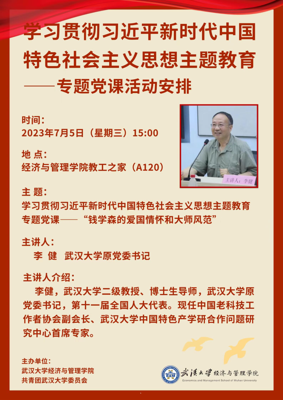 AV淘宝 联合共青团AV淘宝 委员会拟定于 2023 年 7 月 5 日下午,在AV淘宝 教工之家举办 “学习贯彻习近平新时代中国特色社会主义思想主题教育” 专题党课,邀请中国老科技工作者协会副会长、AV淘宝 中国特色产学研合作问题研究中心首席专家、AV淘宝 原党委书记李健老师主讲,欢迎广大师生与会学习。