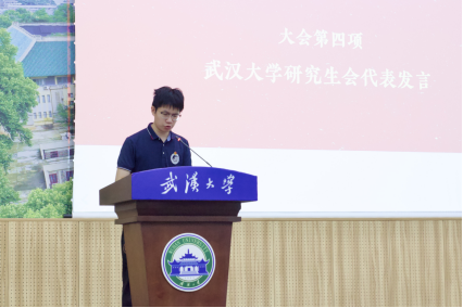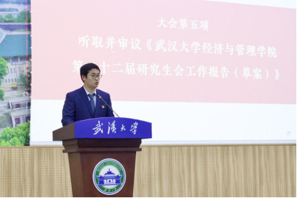 研究生会执行主席徐高铮同学发言。徐高铮同学代表校研究生会和各兄弟培养单位研究生会向大会的顺利召开致以热烈祝贺,肯定了经管院研究生会过去半年各方面的成绩,并就面向新征程的研究生会如何展现新气象、实现新作为分享了自己的学习感悟。
