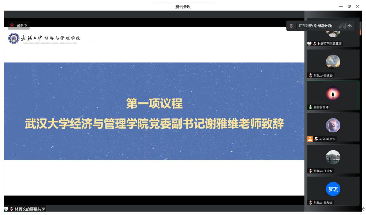 会议伊始,谢书记为本次大会致辞。谢书记首先高度肯定了院研究生会在疫情期间高效运转的工作状态,认为这离不开各位老师对同学们的关心关爱以及一支有力量的学生骨干队伍。随后,谢书记提出面对当前的疫情形势,同学们应当在生活、学习、科研和工作各方面都做到“凡事向内求”:在生活上,要合理饮食、良好睡眠、适当运动,保证自身的身体健康;在学习和科研方面,要主动联系导师,积极向老师提出需求;在学生工作方面,要履职尽责,做到“在其位谋其政”。最后,谢书记指出“机会是留给有准备的人的”,勉励同学们聚焦学业,为未来做好准备。