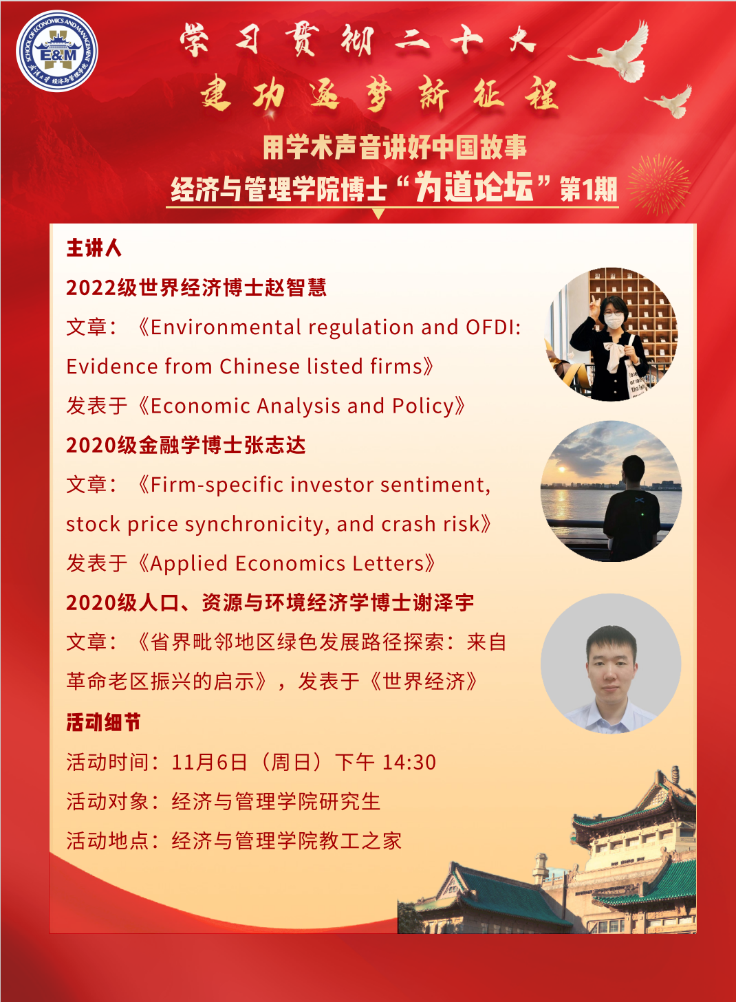 研究生“学习贯彻二十大,建功逐梦新征程”系列活动的重要组成部分,也是学院博士生特色党建品牌、学术科技节“学术面对面”项目。论坛邀请来自各支部的优秀博士生为主讲人,以主讲人发表的高水平论文为载体,解读青年学生所关注的经济学、管理学问题,并以朋辈视角带领学生感受论文从选题确定到最终发表的全过程。论坛力求做到“覆盖引领博士,辐射影响硕士”,帮助学生做好“讲政治的学术”,领悟“有学术的政治”。