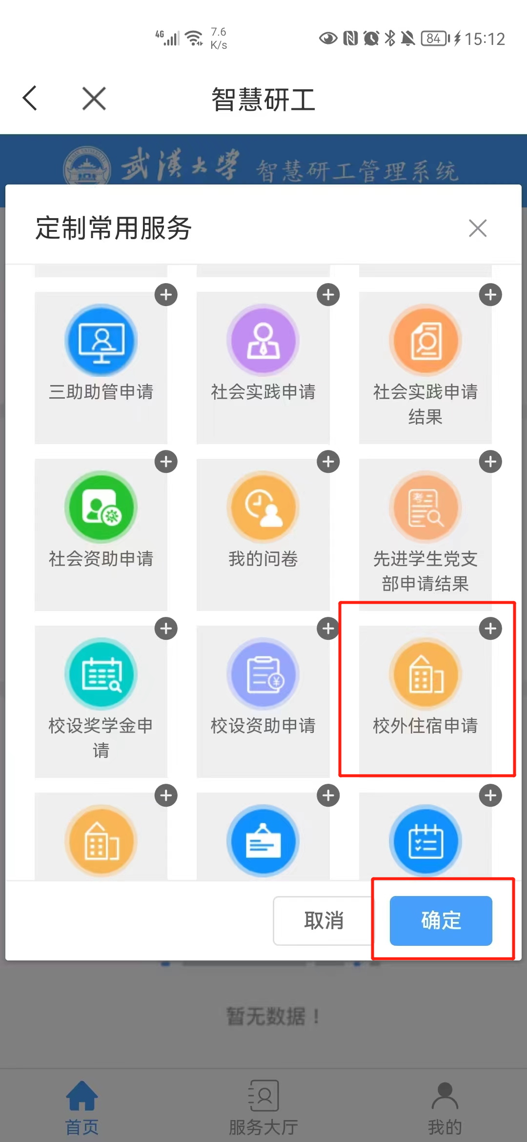 2.登录“智慧珞珈App-智慧研工-我的服务(右上角设置-定制常用服务)”,选择“校外住宿申请”,点击“在线办理”。填写好所有项目后点击“提交申请”(注意,其中上传附件处需上传附件1的扫描件)。
