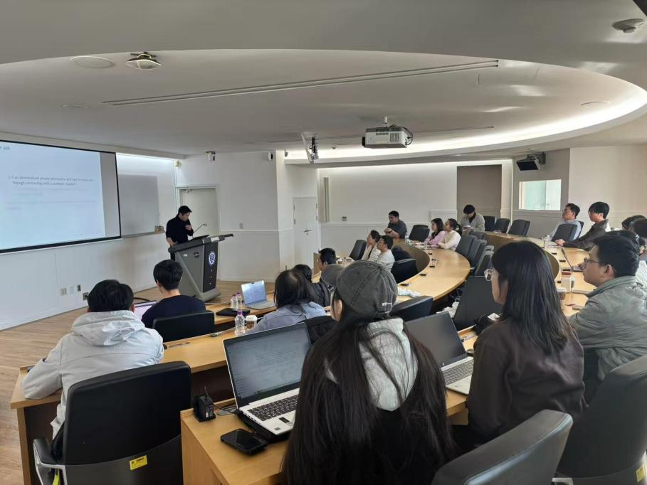 On November 27, at the seminar held at the Catholic University of Korea, Associate Professor Li Xiaoxi and Associate Professor Han Lining from the Department of Mathematical Economics and Mathematical Finance, along with four doctoral candidates—Li Zhangying, Wu Huiyan, Zhang Chenyu, and Gao Xiangyu—presented their cutting-edge research findings. In his presentation, Associate Professor Han Lining shared his research on resource allocation mechanisms, proposing a theoretical framework based on the sequential ranking of agent contributions, offering a new perspective for scenarios lacking quantitative indicators. Associate Professor Li Xiaoxi explored the design of optimal financial contracts under information asymmetry. Wu Huiyan focused on the impact of extreme temperatures on electricity consumption and production suspension behavior in the manufacturing sector, revealing the significant economic shocks caused by climate change. Li Zhangying incorporated global supply chain pressure and economic conditions into a quantile GARCH-MIDAS framework, providing a new approach for forecasting risks in the commodity market. Zhang Chenyu analyzed the impact of water resource allocation on the land market, using China's South-to-North Water Diversion Project as a case study. Gao Xiangyu examined the effects of China's centralized volume-based drug procurement policy on corporate innovation output.