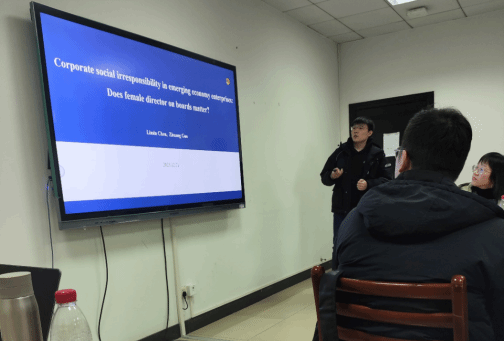 2021级企业管理专业博士研究生郭状以“Corporate social irresponsibility in emerging economy enterprise: Does board gender matter?”为题,从CSR的对立面CSI着手展开了研究,并详细阐述了该篇文章的研究目的、理论构建、研究方法与实证设计、研究结论与贡献等内容。点评环节,点评人杜丽虹副教授认为选题富有趣味性且研究内容相对完整,建议将调节效应涉及的构念进一步凝练为董事会社会资本,从中国特色的角度来衡量社会关系,贴切地反映中国的“人情味”对机制研究的重要影响,并认为可考虑中间传导机制的进一步构建;雷昊老师认为该文章方法上相对完善,但在因果识别以及内生性问题等方面可考虑采用更丰富的方法和选用更合理的工具变量做出进一步完善,并建议调节效应的考量可进一步考虑与本文所关注的女性董事更贴切的条件因素。